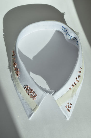 Our collars are crafted from thoughtful, luxury materials like organza, beaded trim, brass hardware, and silk blends, all set on a 100% cotton base. Each one is hand-finished, limited edition, and designed to feel like wearable jewelry.